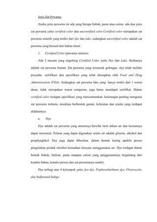 Identifikasi Pewarna Makanan : Di indonesia, peraturan mengenai penggunaan zat pewarna yang diizinkan dan dilarang.